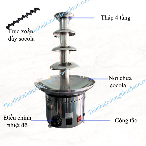 - Tháp socola với thiết kế 4 tầng cao cấp, tháp phun đều, tạo hiệu ứng socola chảy liên tục bắt mắt.