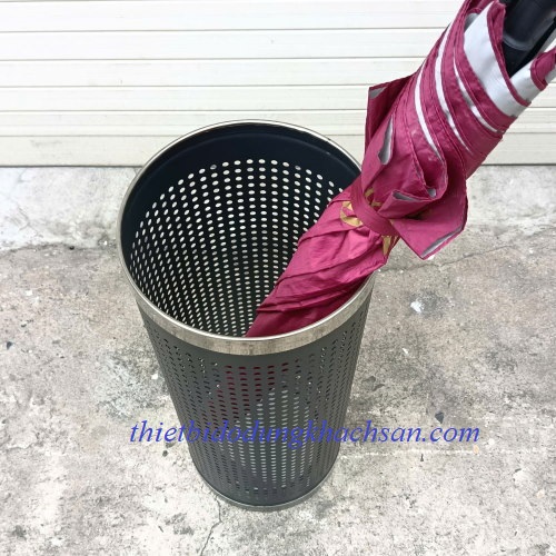Thùng có hình ống trụ tròn với viền inox 2 đầu, trên thân thì được dập nhiều lỗ tròn nhỏ giúp không khí lưu thông tốt, ô dù nhanh ráo nước