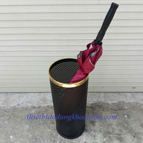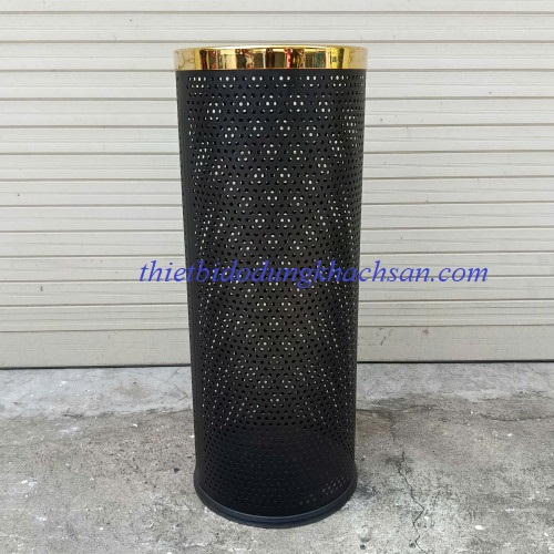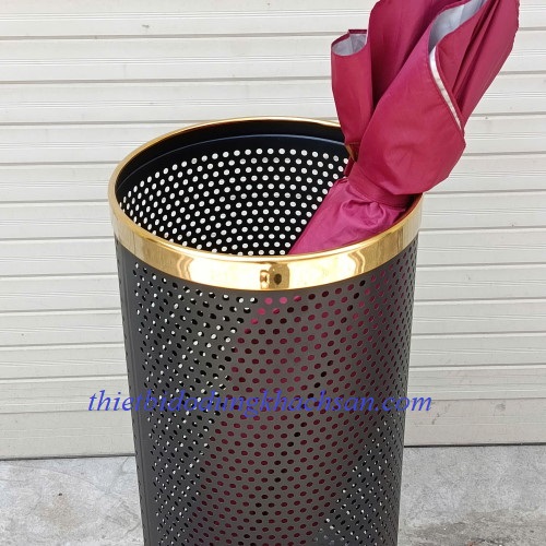 Thùng đựng ô dù tròn viền vàng là sản phẩm được thiết kế chuyên dụng để đựng ô dù với 2 chất liệu chính là sắt sơn tĩnh điện màu đen kết hợp với viền inox vàng tạo điểm nhấn sang trọng cho khu vực lắp đặt chúng. Ngoài ra trên thân thùng có còn được dập nhiều lỗ nhỏ giúp gió dễ lọt vào bên trong để cho ô dù bên trong mau được khô ráo hơn.